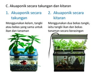 Soalan Nota Bahan Rujukan Penting Semua Subjek. Rajah 252 Sistem akuaponik secara takungan Akuaponik Secara Kitaran Gambar Foto 254 Sistem akuaponik secara kitaran Sistem akuaponik secara kitaran menggunakan dua bekas tangki iaitu tangki ikan dan bekas tanaman secara berasingan. Reka bentuk yang dihasilkan mestilah dapat menyelesaikan masalah dan dapat memenuhi tujuan produk dibuat.